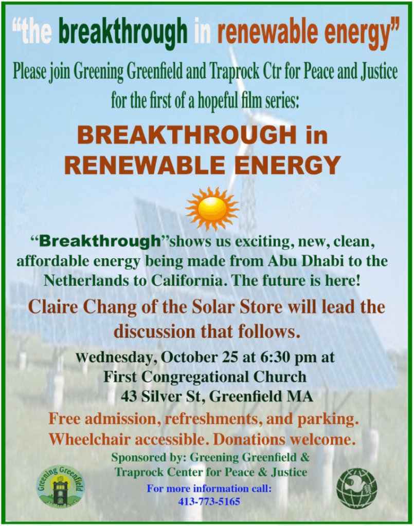 This film explores the newest creative developments in the making and storing of solar and wind energy in use and/or development today in such disparate places as the Netherlands and Abu Dhabi. “While we have been despairing that the USA is withdrawing from the Paris Accord, scientists and engineers have been working on solving today’s energy problems. Thanks to their dedication, fossil fuels will soon be obsolete,” says Nancy Hazard, NESEA retiree, and Greening Greenfield member. Claire Chang of The Solar Store of Greenfield will lead the discussion and fill us in on developments close to home.